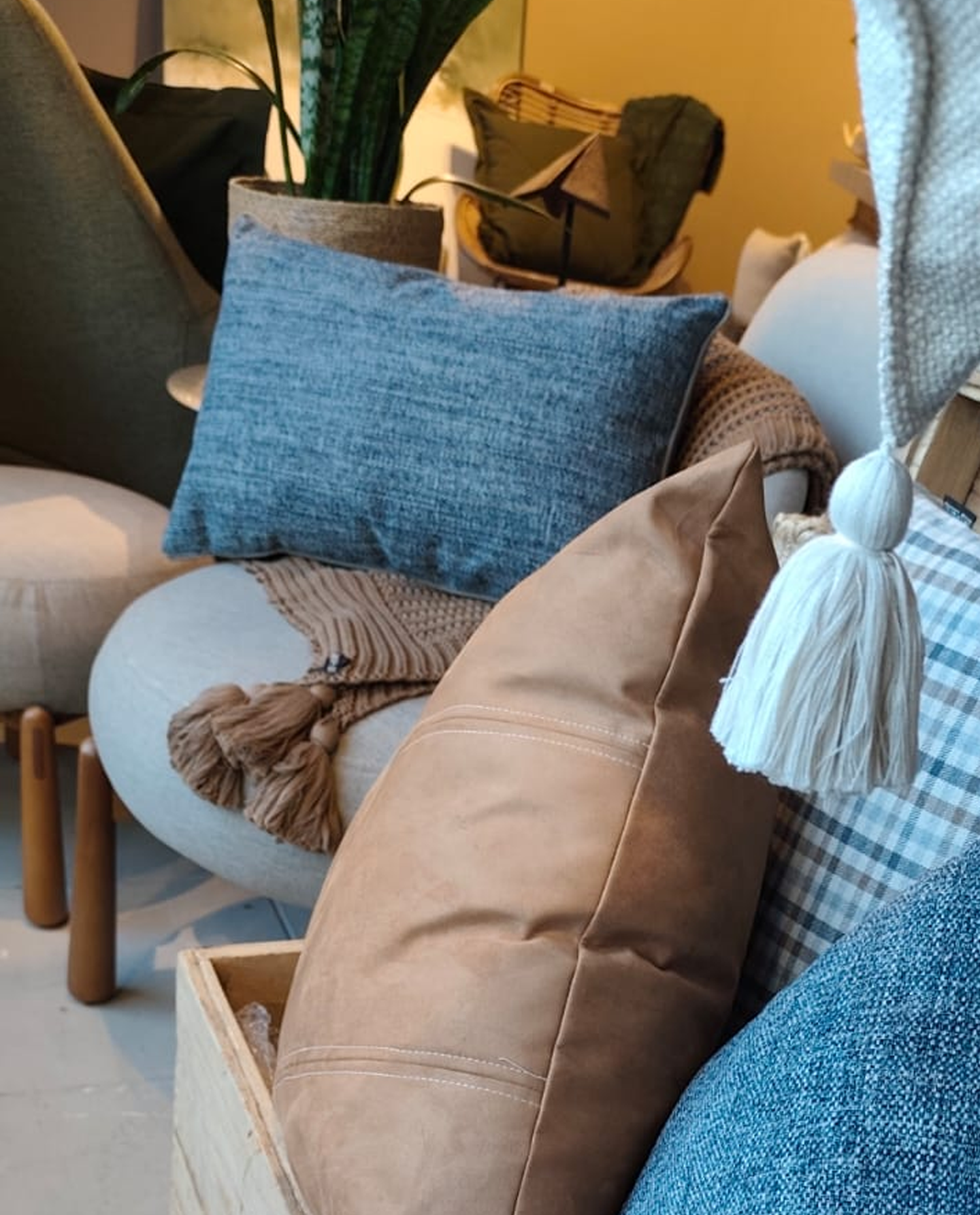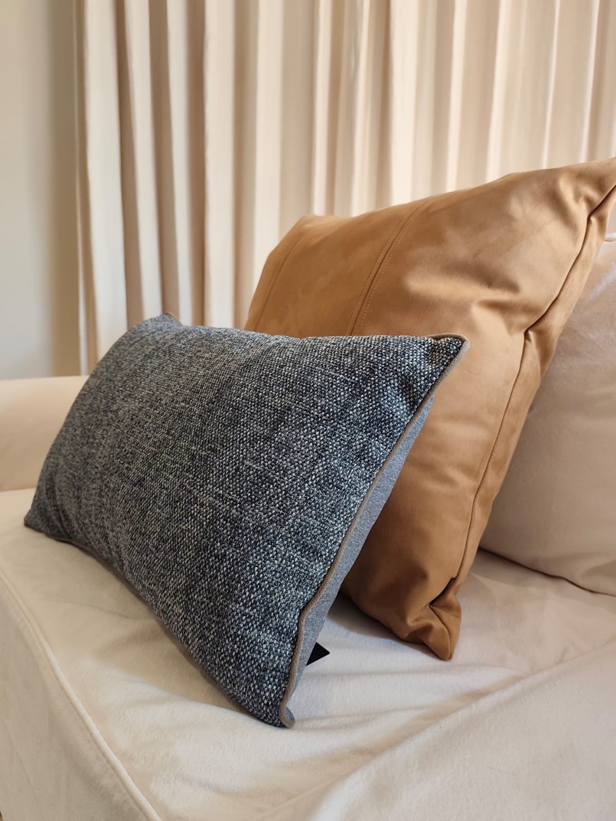 Almofada rústica na cor azul com capa dupla no tamanho 35x52cm.