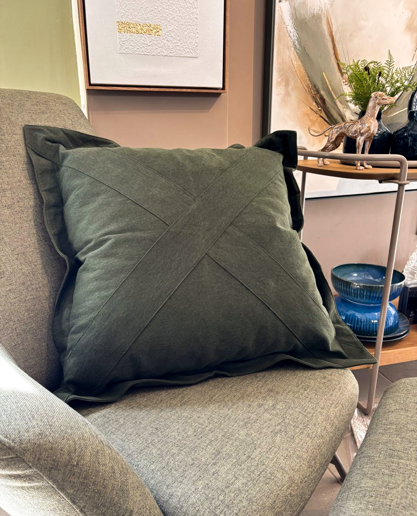 Almofada quadrada 70x70cm feita em algodão com detalhe de X no centro e bordas.