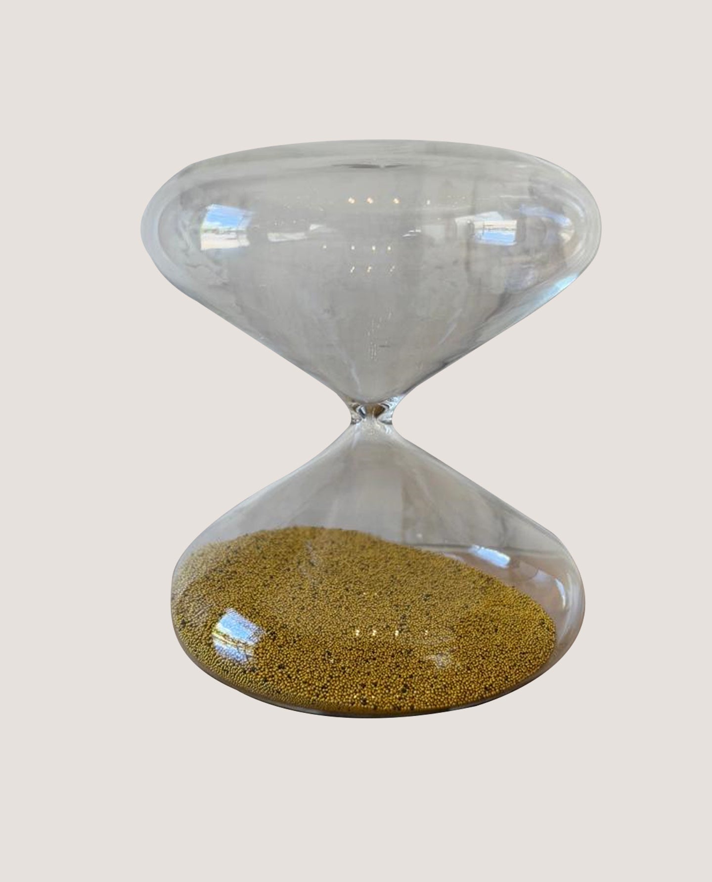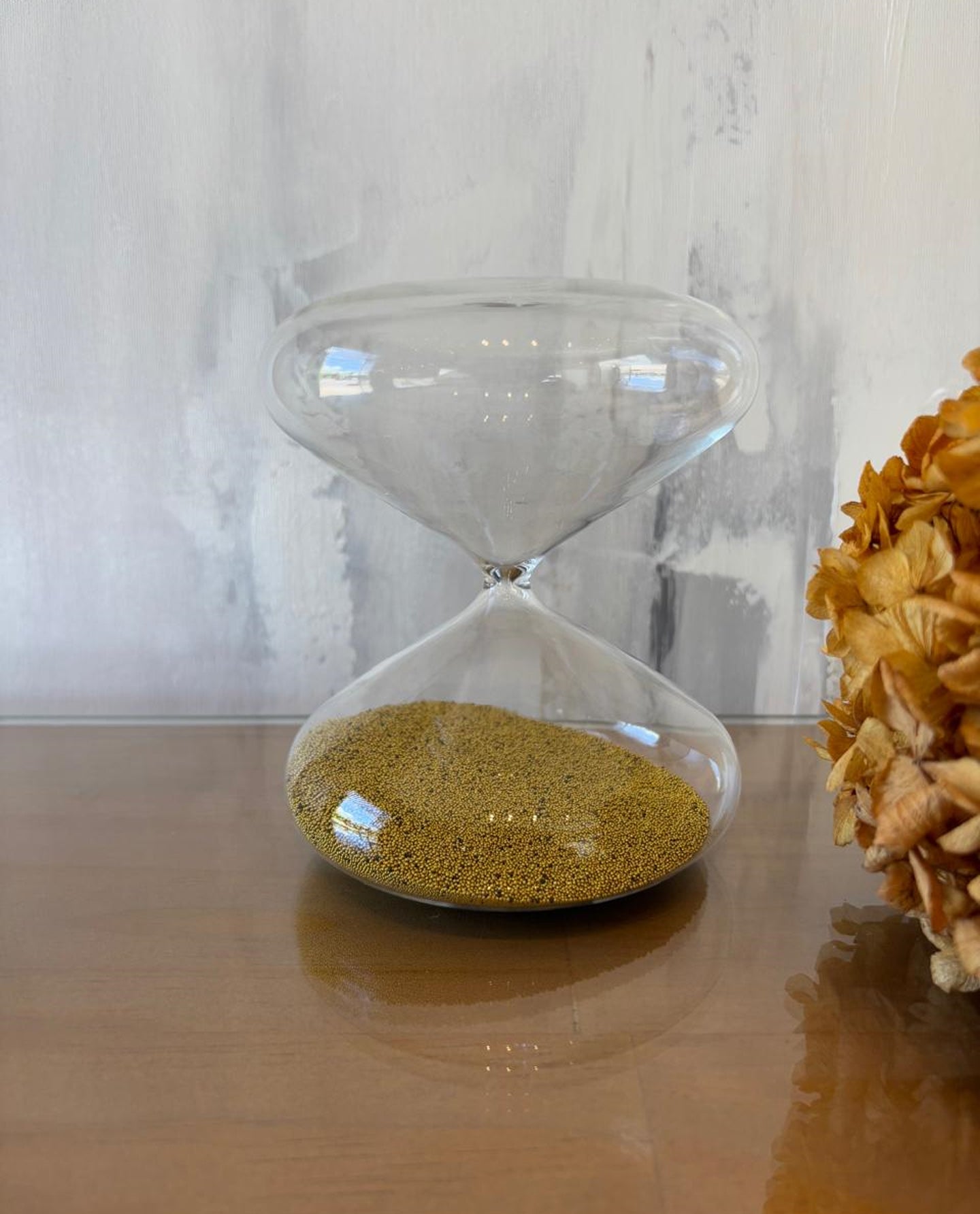 Ampulheta feita em vidro e areia, perfeita para ambientes como escritório ou escrivaninha do quarto.