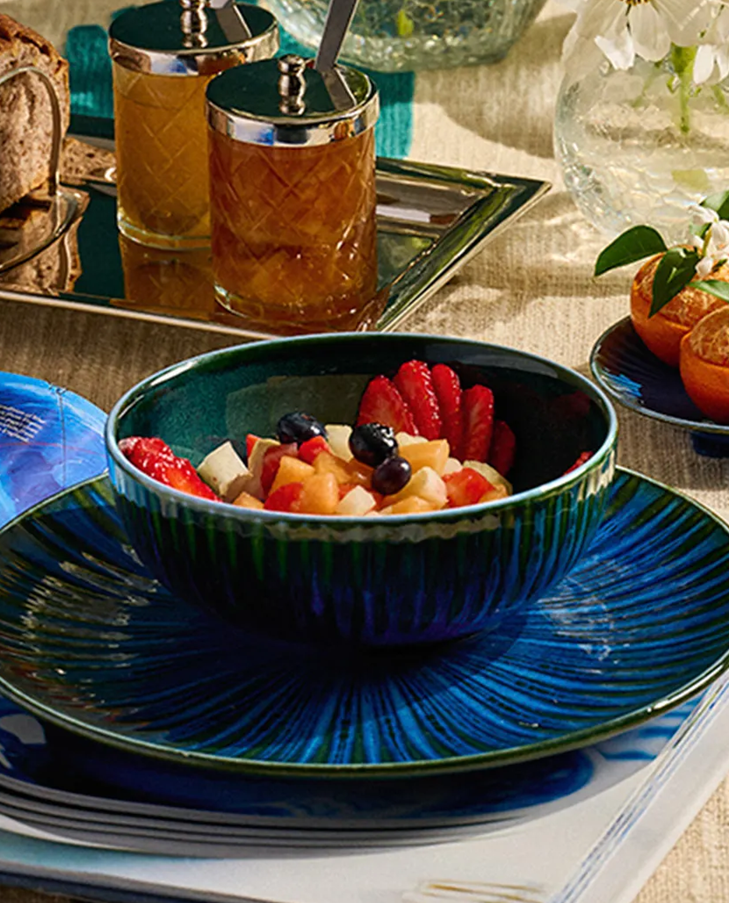 O Bowl Vitória Régia é produzido artesanalmente em porcelana de fundo bicolor, azul e verde de formato redondo. Através de processos químicos, toda a superfície interior da peça é feita de padronagem de linhas espiraladas orgânicas levemente texturizadas, que remetem a figura da planta aquática vitória-régia.