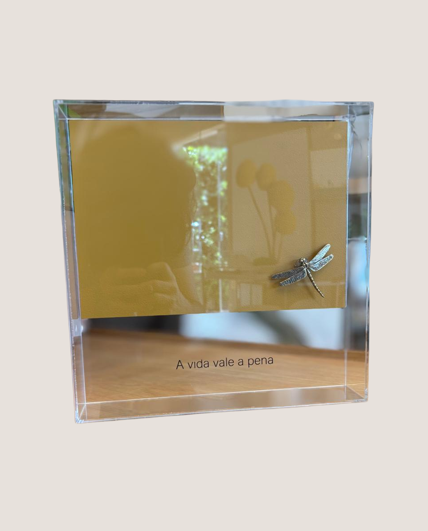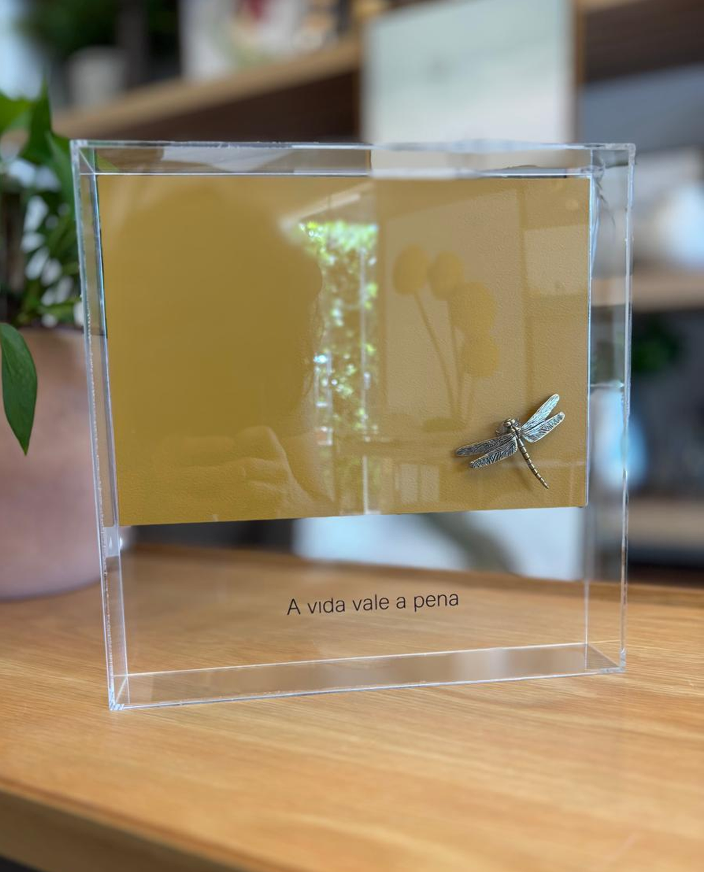 Une elegância, delicadeza e inspiração em uma peça moderna e sofisticada. Com fundo em tom mostarda e o toque refinado de uma libélula metálica, o design transmite leveza e reflexão, acompanhado da frase “A vida vale a pena”, que reforça uma mensagem positiva e motivadora.