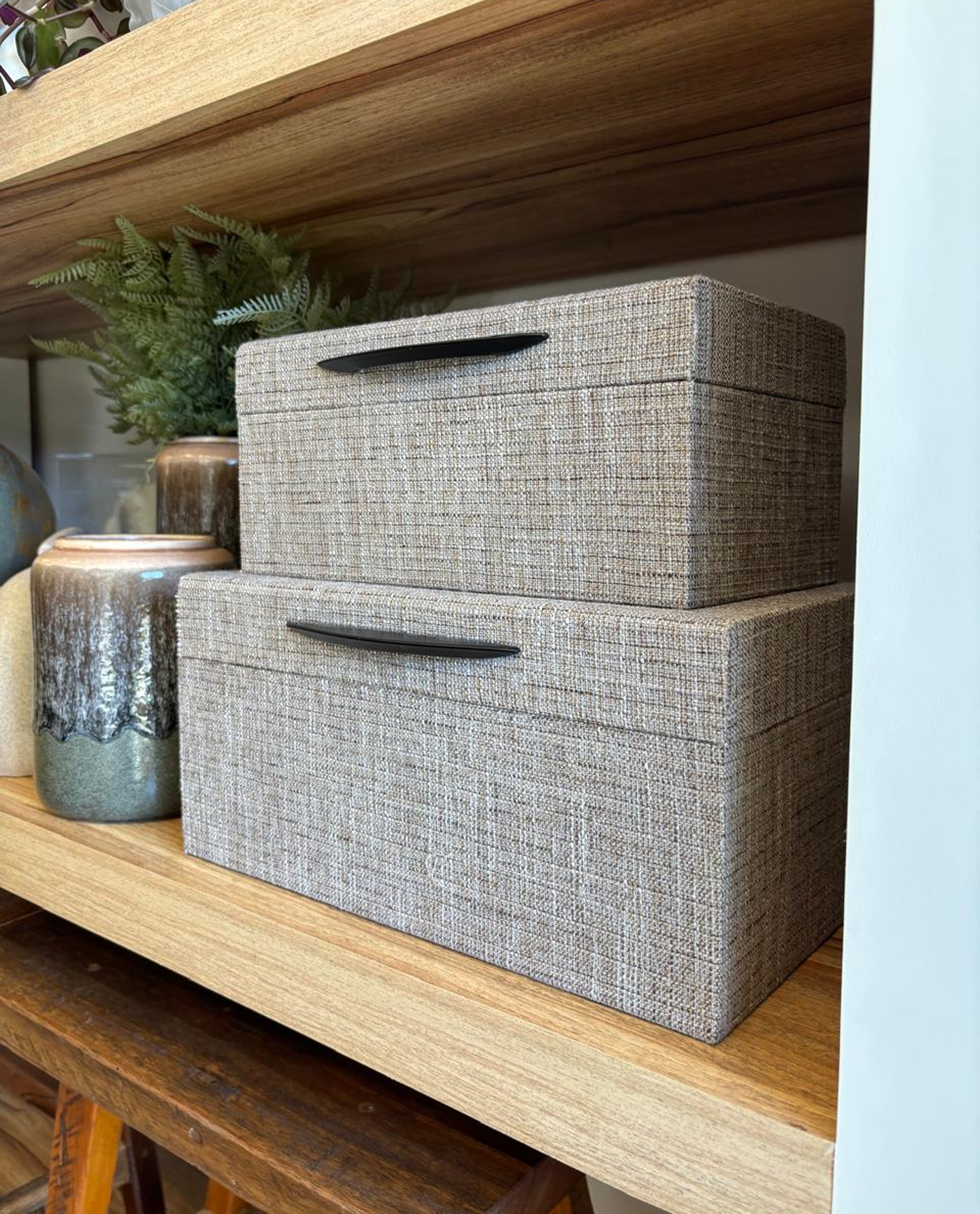 Desenvolvida para trazer praticidade e elegância ao dia a dia. Seu acabamento em tecido texturizado cinza dá um toque moderno e sofisticado, combinando facilmente com qualquer ambiente. Possui tampa com fecho de aba discreto e alça frontal em cor preta, que facilita o manuseio.