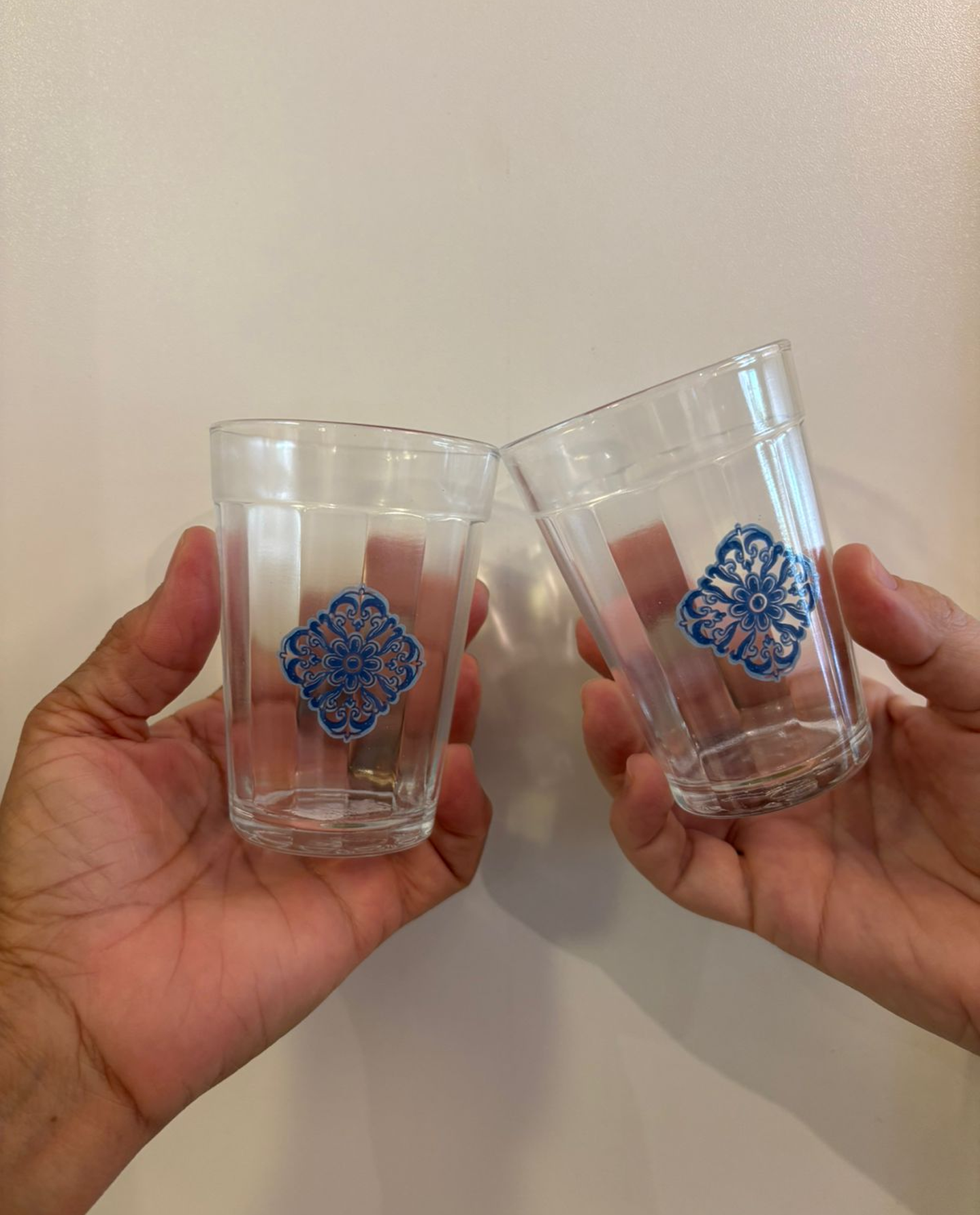 Elegante e versátil, o conjunto de 4 copos de vidro é ideal para servir água, sucos ou bebidas diversas com um toque de sofisticação. O design clássico ganha charme extra com o detalhe decorativo em azul, inspirado em padrões artesanais, que traz personalidade à mesa.