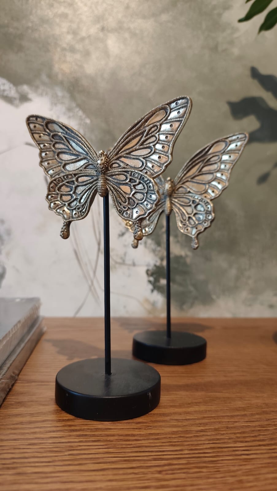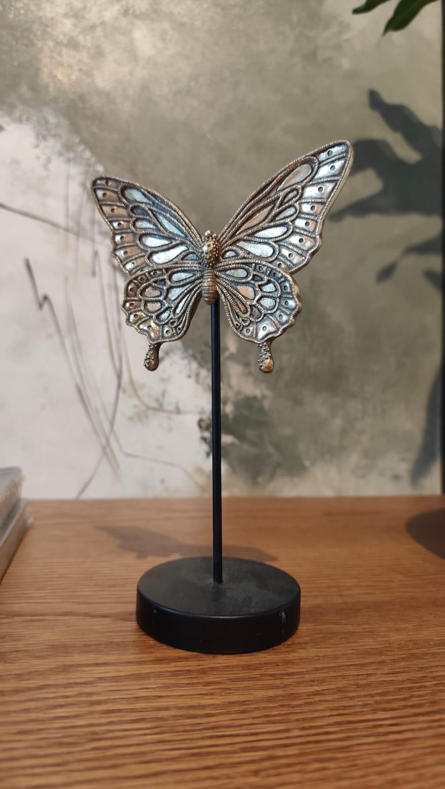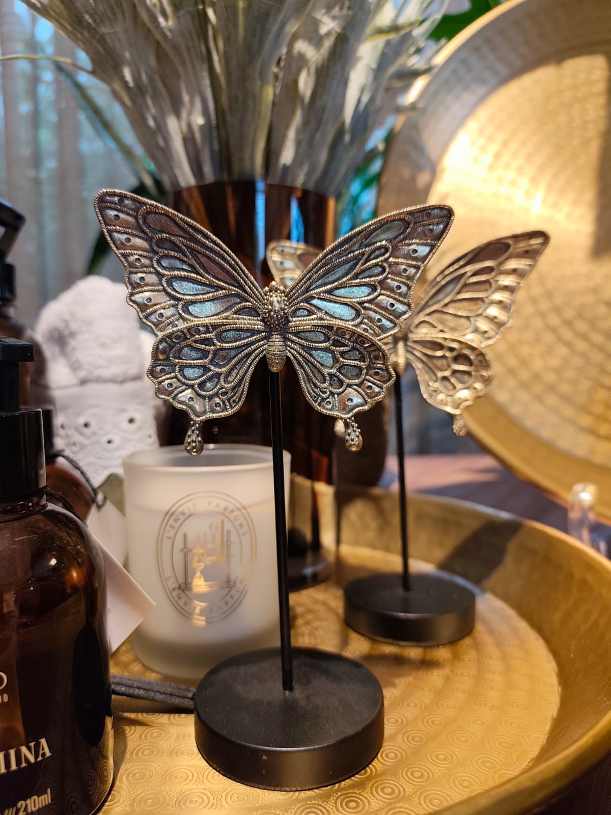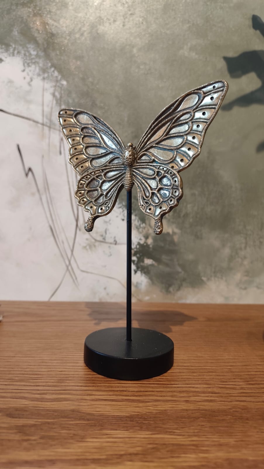 Escultura Borboleta Dourada que une materiais nobres em uma composição harmoniosa. O corpo da borboleta em resina recebe acabamento dourado que captura a luz com elegância, enquanto a haste em metal preto oferece sustentação robusta e contraste visual marcante. A base em resina com pintura preta garante estabilidade e complementa o design sofisticado. Uma peça de decoração que equilibra leveza artística com solidez estrutural, ideal para ambientes que valorizam refinamento e contemporaneidade.