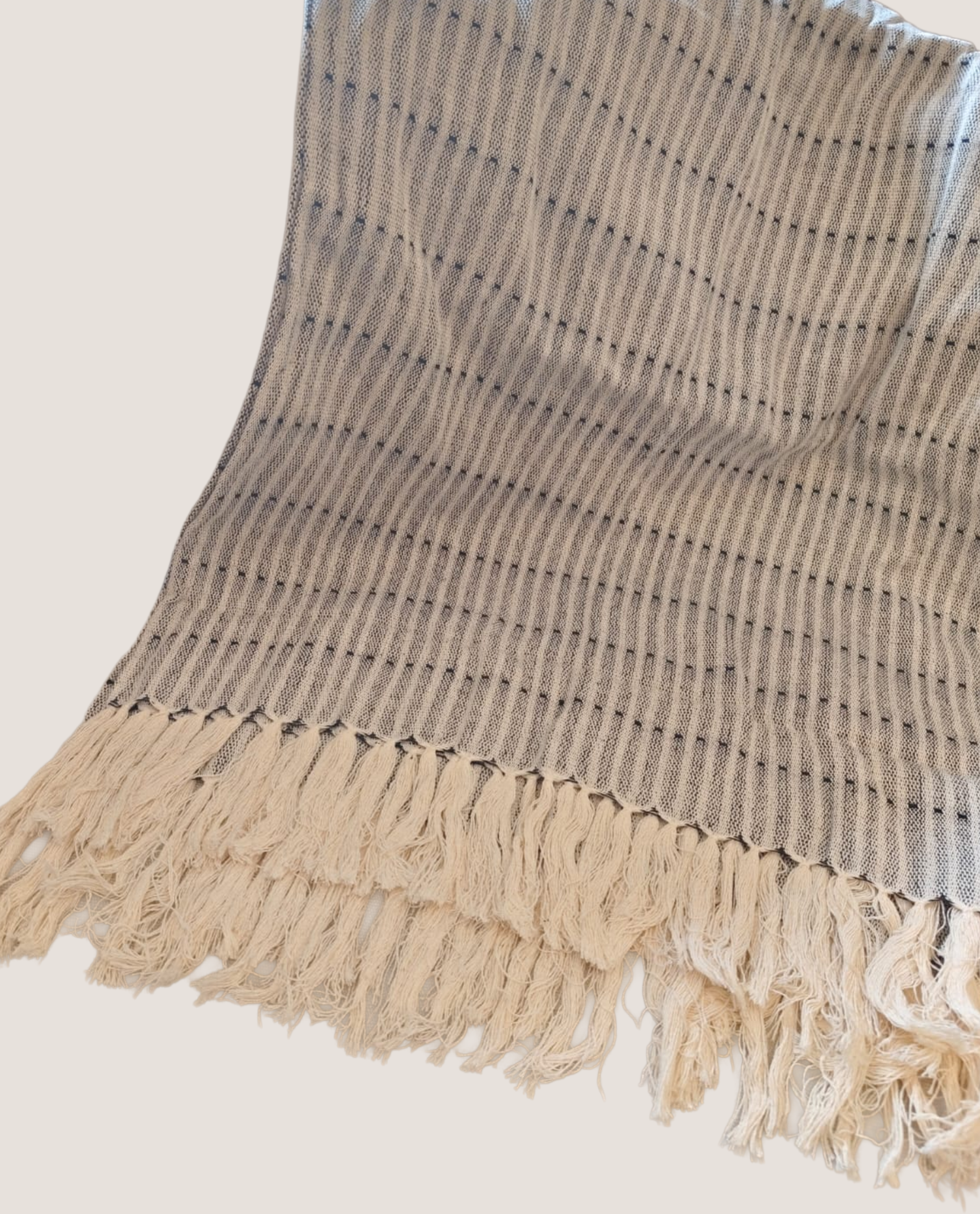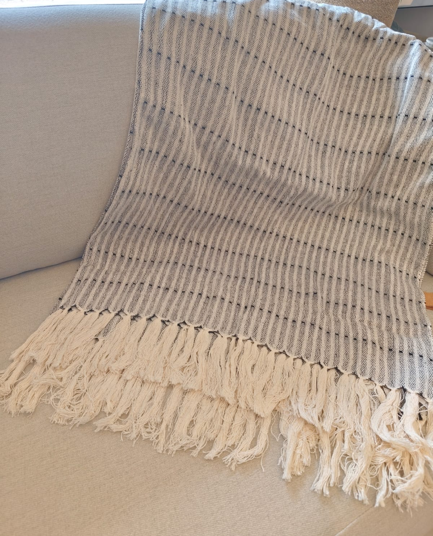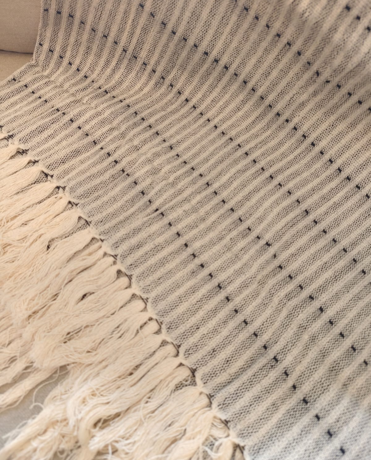 Manta para sofá preta e branca 100% algodão, bordada com detalhes de babados, na medida 194cm x 118cm