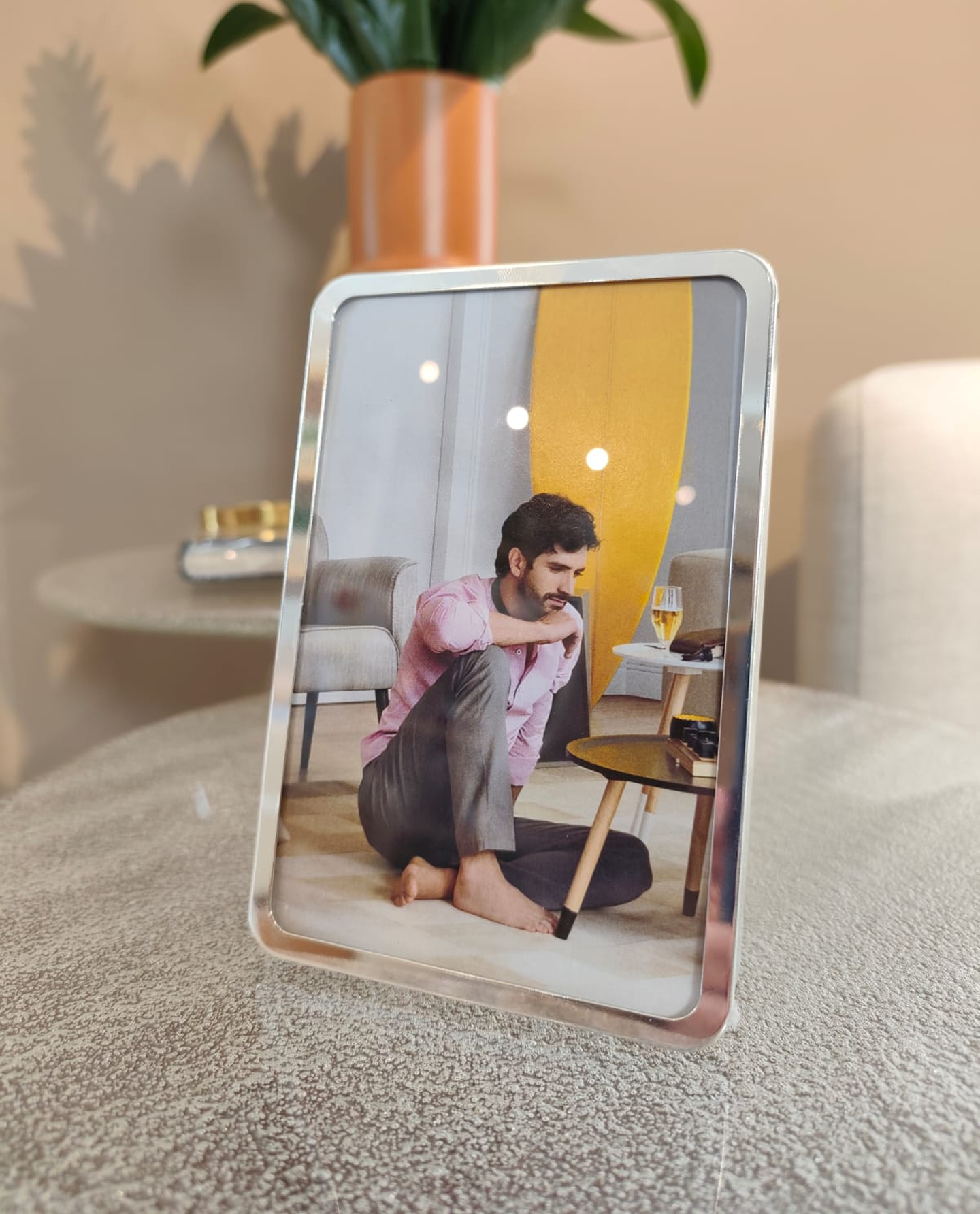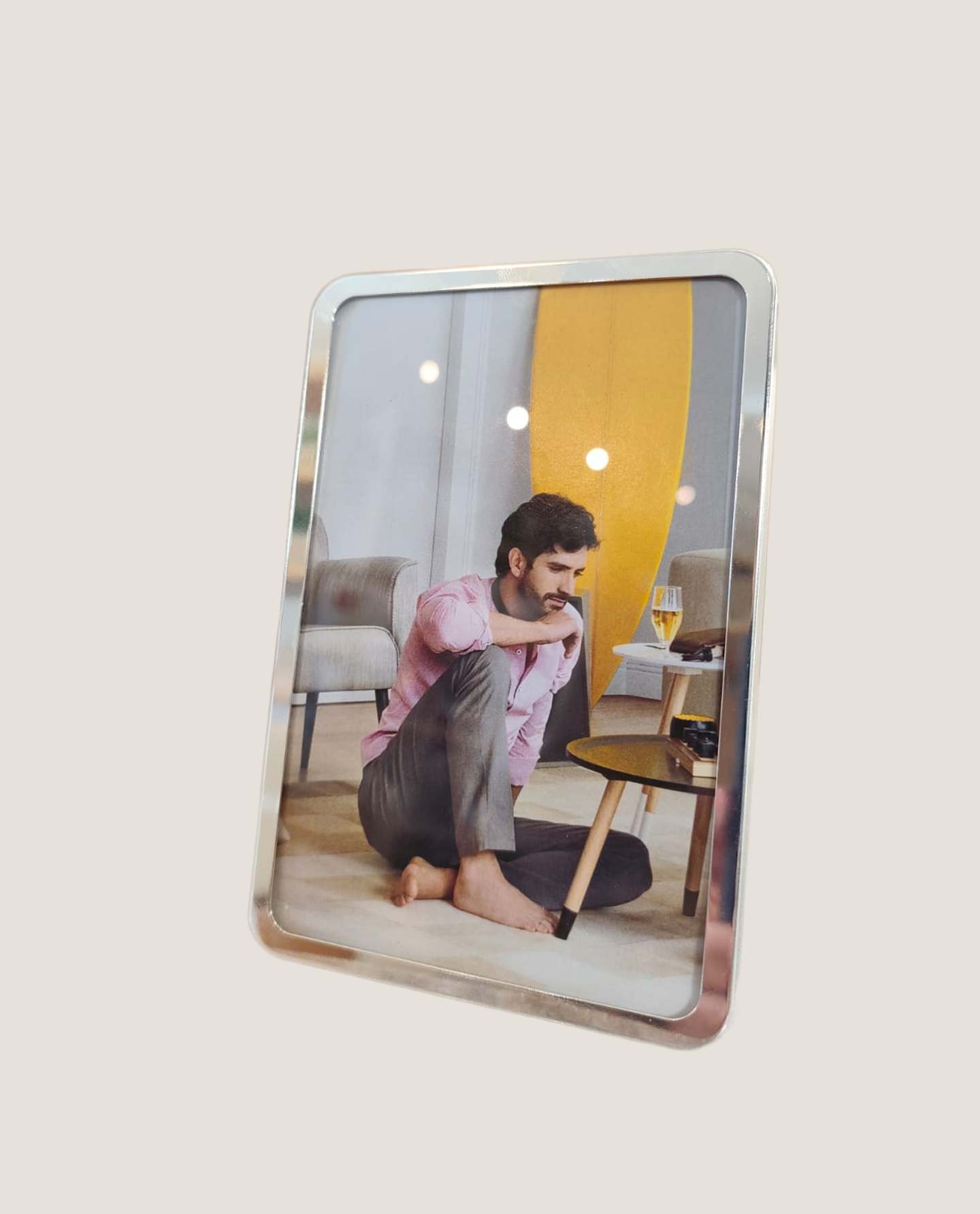 Porta retratos feito em metal com pintura cromada e quinas arredondadas.