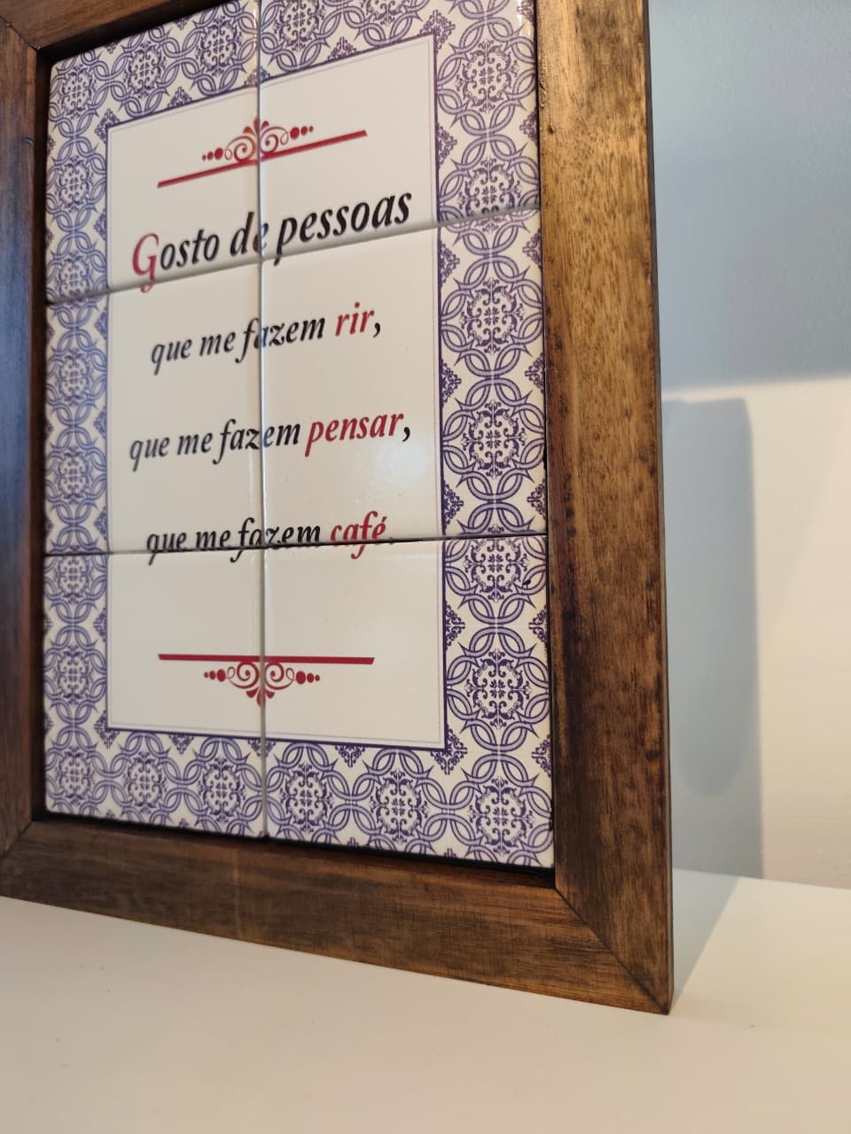 Quadro café rústico, com moldura em madeira e azulejos no tom de azul e branco. Ideal para cozinha e cantinho do café.