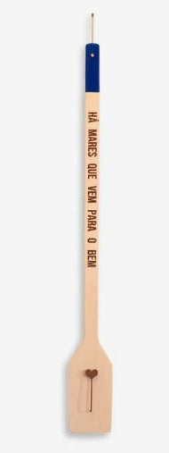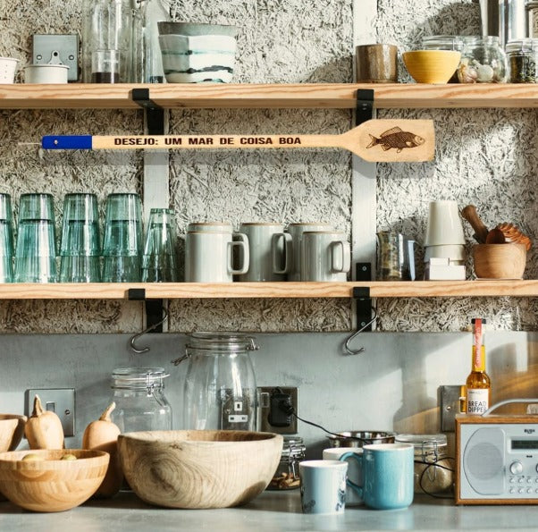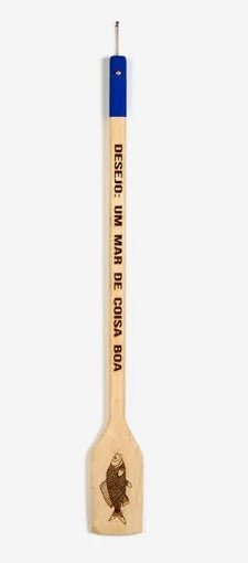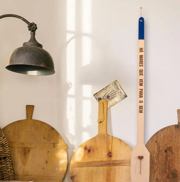 Remo decorativo em madeira, peça funcional que combina artesanato e design. Apresenta frase esculpida no corpo, conferindo personalidade e significado ao objeto. O detalhe em azul na ponta do cabo adiciona um toque de cor sofisticado, criando contraste visual elegante. Ideal para decorar ambientes costeiros, salas de estar ou espaços que valorizam elementos náuticos. Versátil, pode ser apoiado na parede ou exibido em cantos estratégicos da casa, funcionando como conversa visual que une funcionalidade estética com narrativa pessoal.
