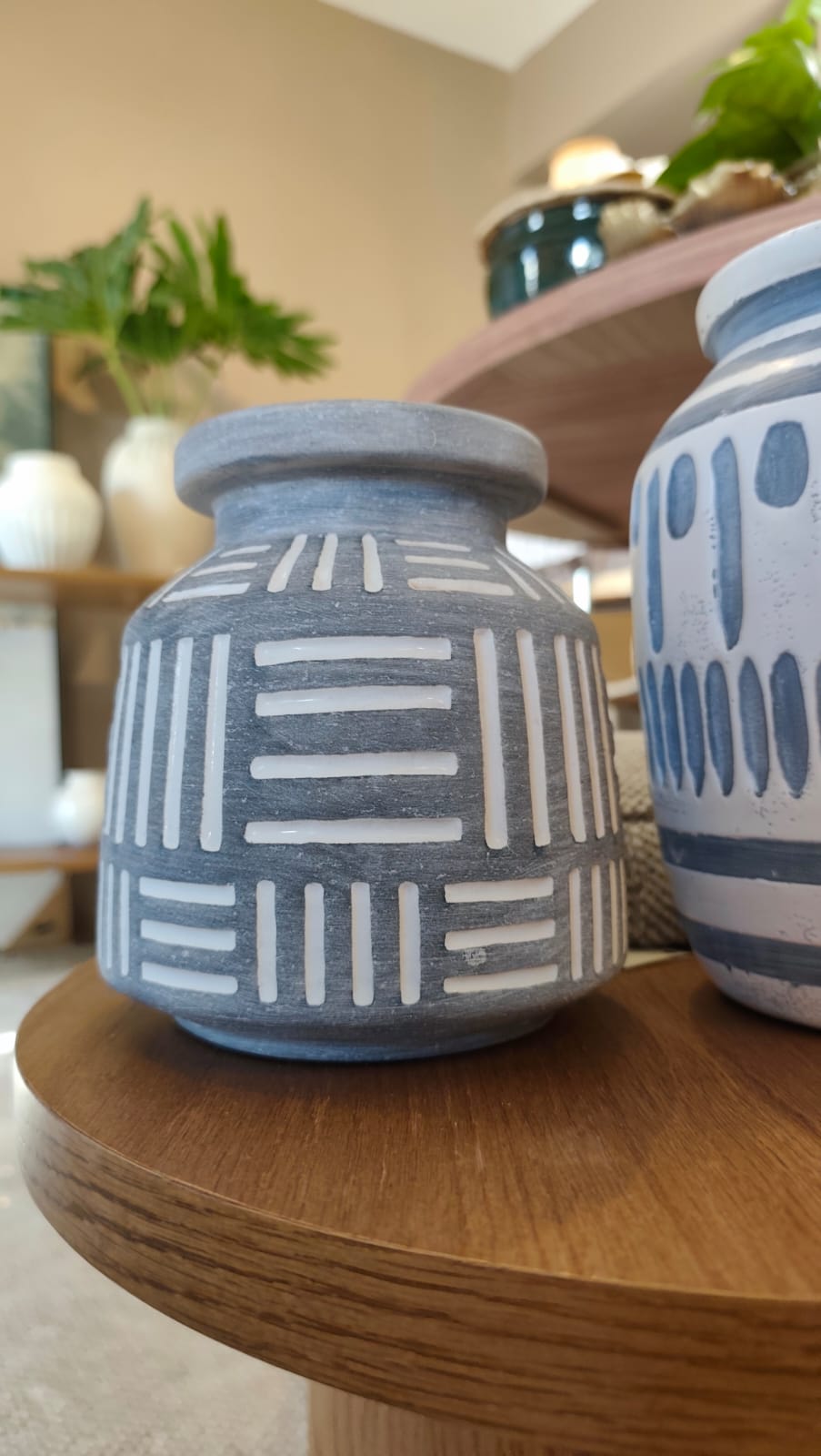 Vaso em cerâmica cinza com acabamento artesanal que apresenta delicados riscos brancos entalhados na superfície. Cada detalhe é cuidadosamente trabalhado, criando um padrão único que adiciona textura e sofisticação ao objeto. Ideal para complementar ambientes modernos ou rústicos, este vaso funciona tanto como peça decorativa quanto como recipiente funcional para flores secas ou arranjos. Sua tonalidade neutra permite fácil integração com diferentes estilos de decoração, enquanto os entalhes brancos conferem um toque de elegância minimalista.