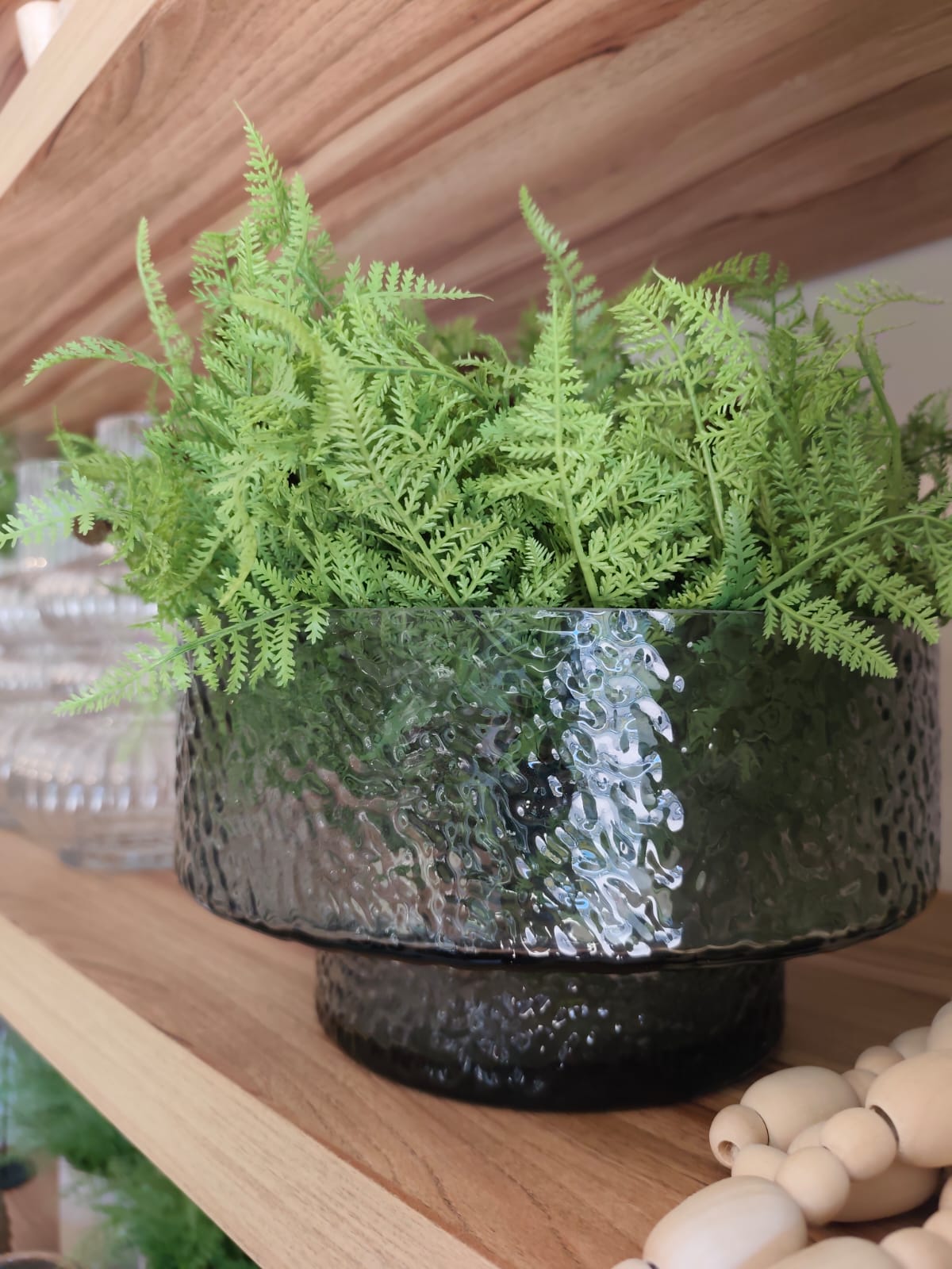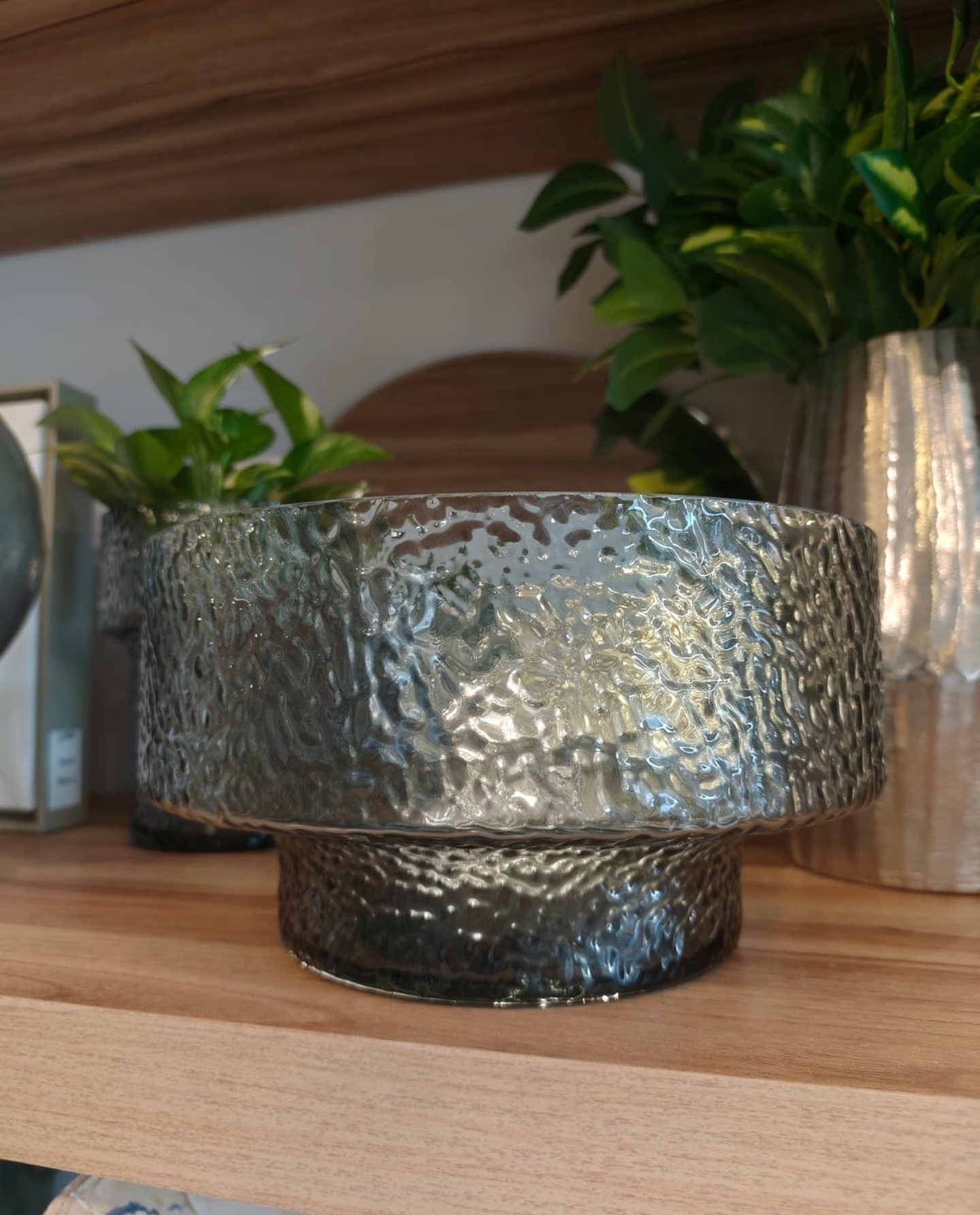 Vaso feito em vidro fumê de alta qualidade com detalhes em relevo por todo o vaso e formato moderno.