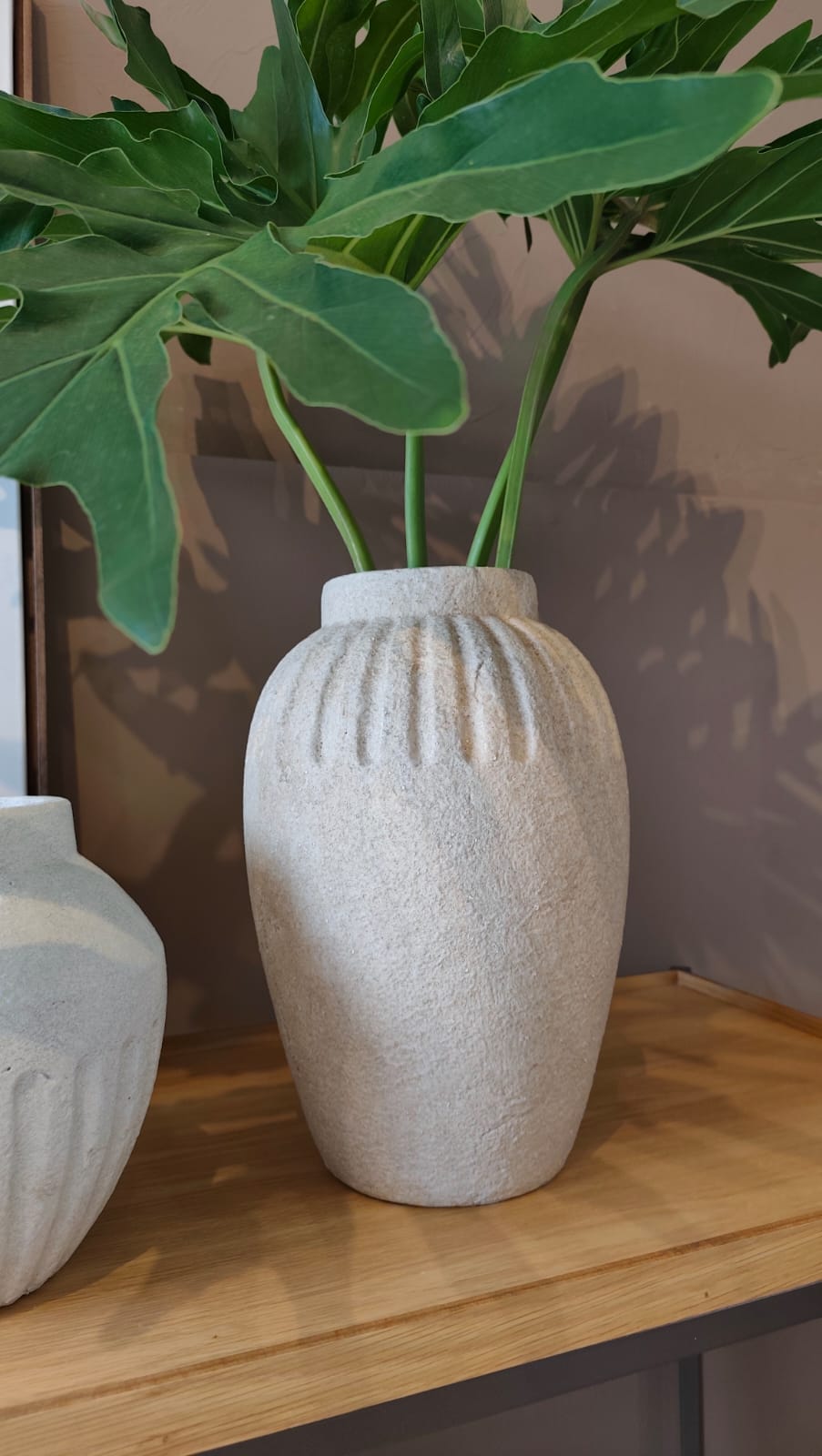 Este vaso em formato meio ovalado é perfeito para adicionar um toque de elegância e sofisticação à sua casa. Feito em cerâmica na cor off white, ele apresenta um detalhe canelado próximo à boca e uma textura de areia, adicionando um toque de textura e interesse visual.
